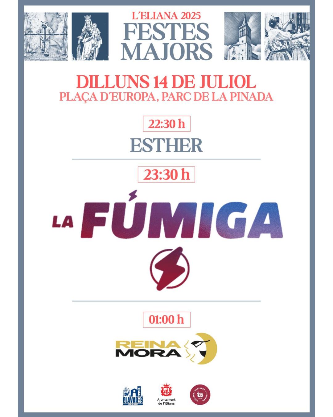 La Fúmiga x Reina Mora juliol 14, 2025 @ 11:00 pm - juliol 15, 2025 @ 3:00 am Festes Majors L'Eliana Plaça d'Europa, L'Eliana, Valencia, Spain Gratuït